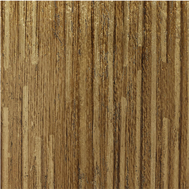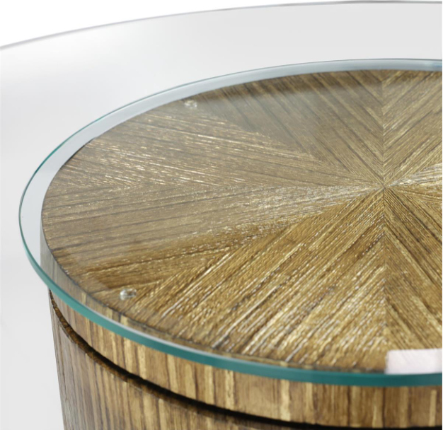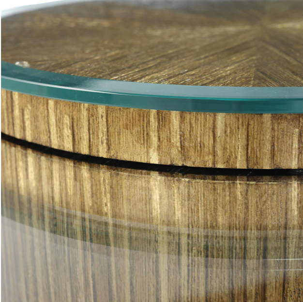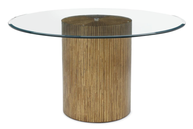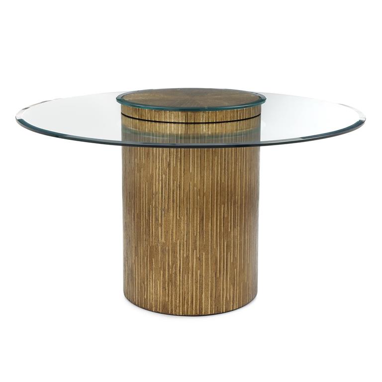 The Stria Dining Table is a stunning contemporary piece that instills an interior space with rich texture and ornate tones. A rounded wood base is adorned in a distressed Linea Oro finish, enriching the piece with a gorgeous golden hue accented with textural lines. A rounded pane of beveled, tempered glass serves as the tabletop, matched by a removable lazy susan.