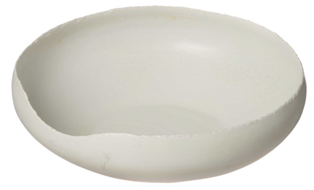 The white sand bowl is made of porcelain and has an reactive white glaze with soft subtle traces of light celadon. The color is reminiscent of sea glass on a white sand beach. With an organic edge detail this low bowl is perfect as a centerpiece or multi use piece and blends with many decor styles.