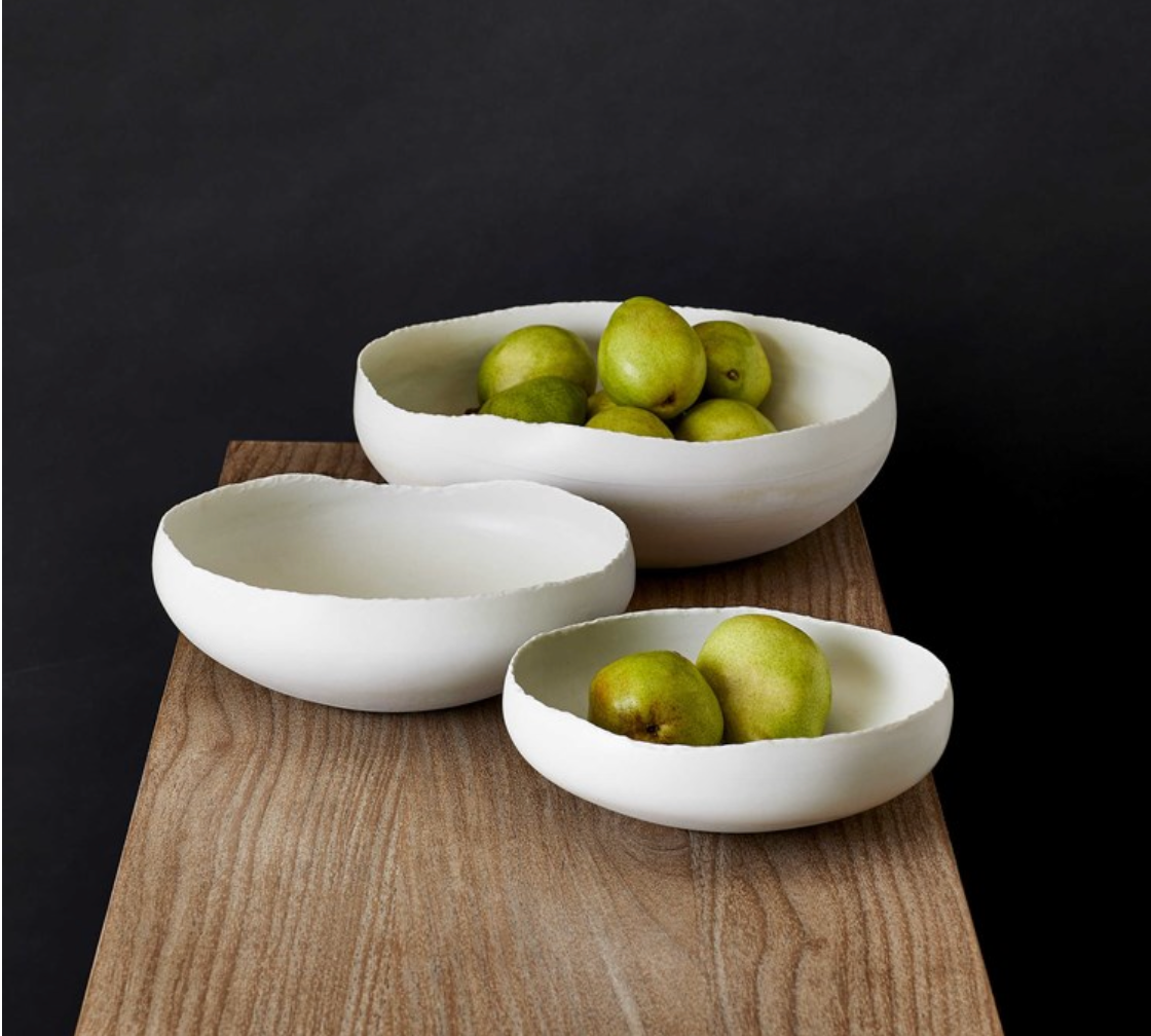 The white sand bowl is made of porcelain and has an reactive white glaze with soft subtle traces of light celadon. The color is reminiscent of sea glass on a white sand beach. With an organic edge detail this low bowl is perfect as a centerpiece or multi use piece and blends with many decor styles.