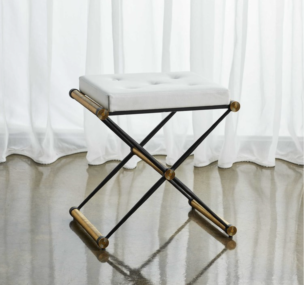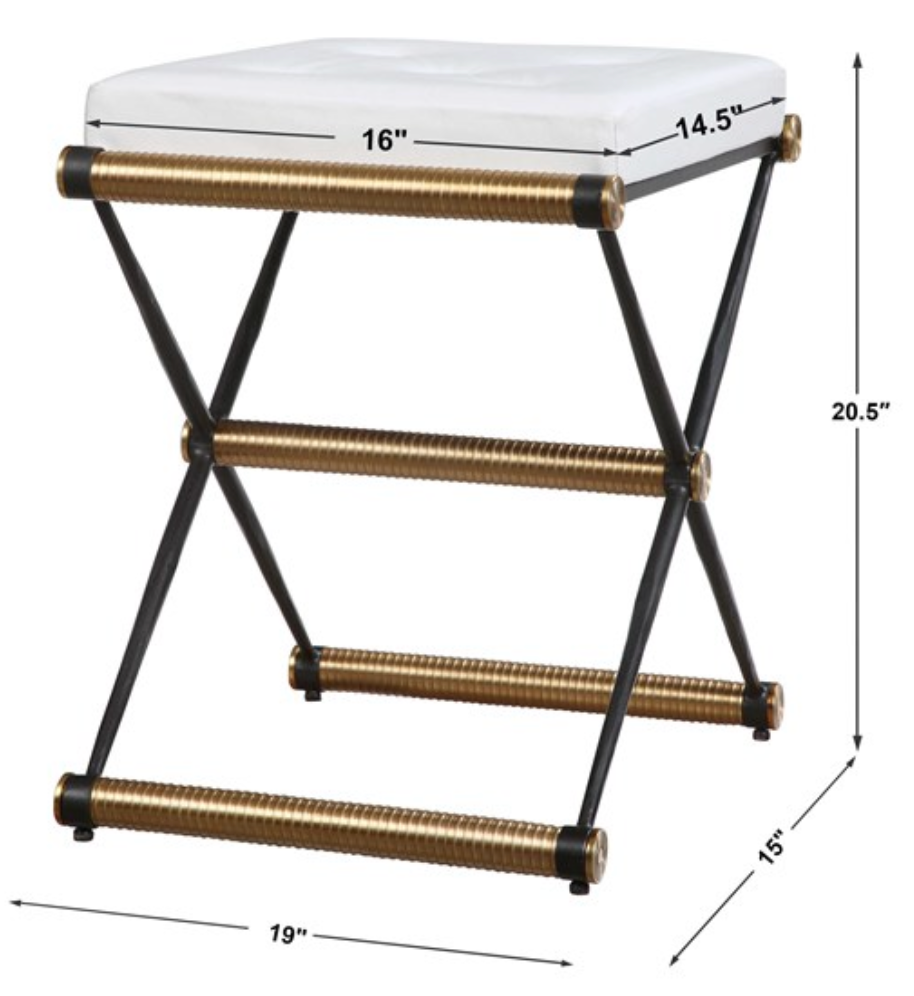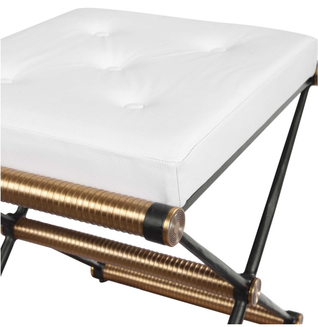 Two x-shaped iron legs are joined with five reeded polished brass rods and medallions. Removable cushion covered in white leather is diamond tufted. Seat height is 21".