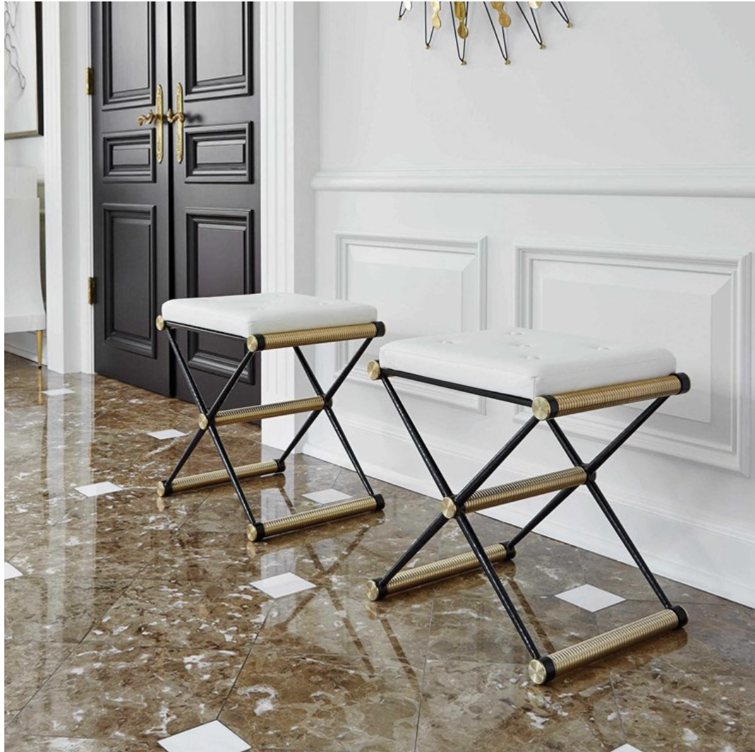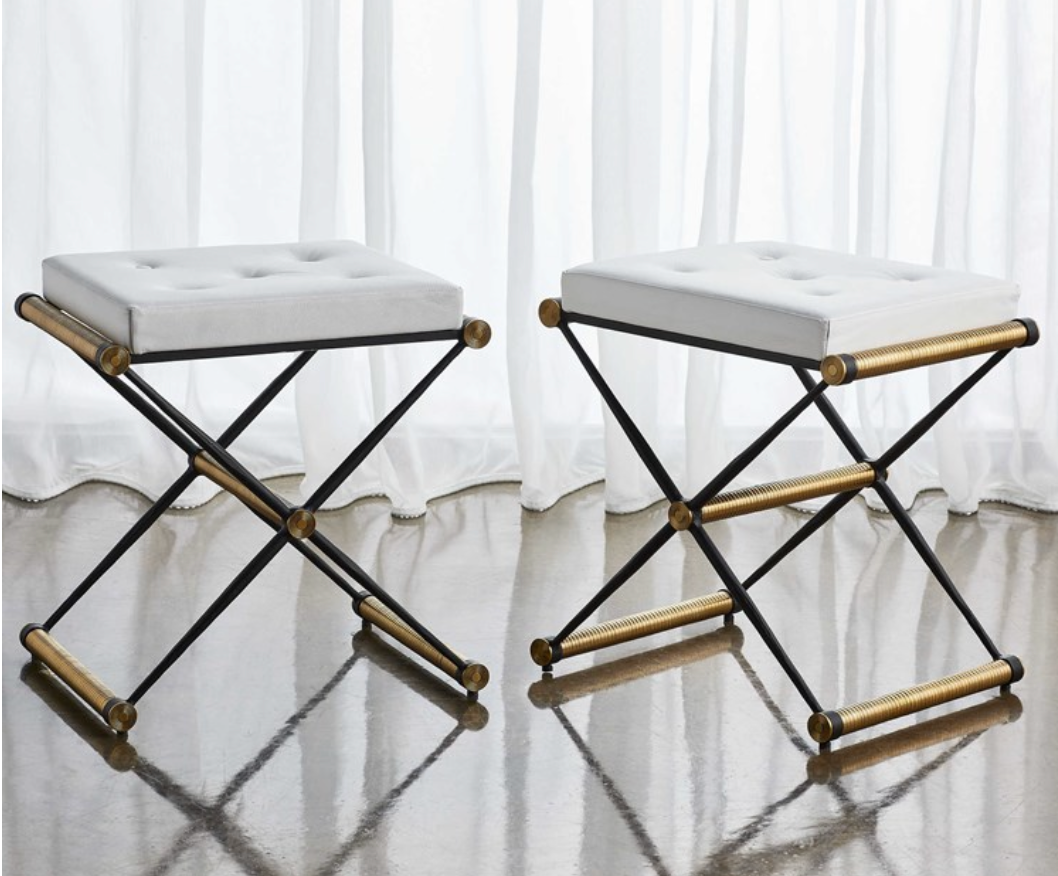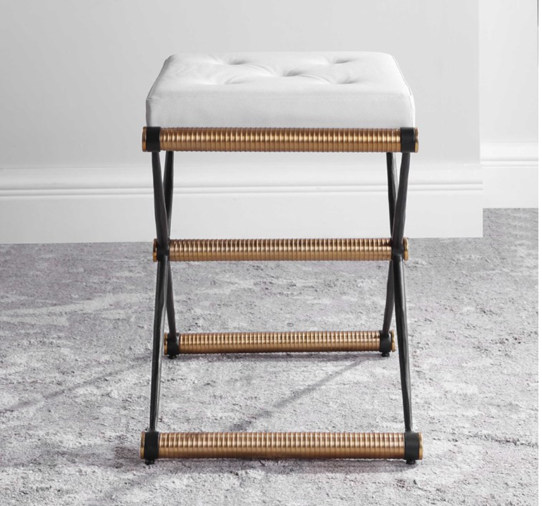 Two x-shaped iron legs are joined with five reeded polished brass rods and medallions. Removable cushion covered in white leather is diamond tufted. Seat height is 21".